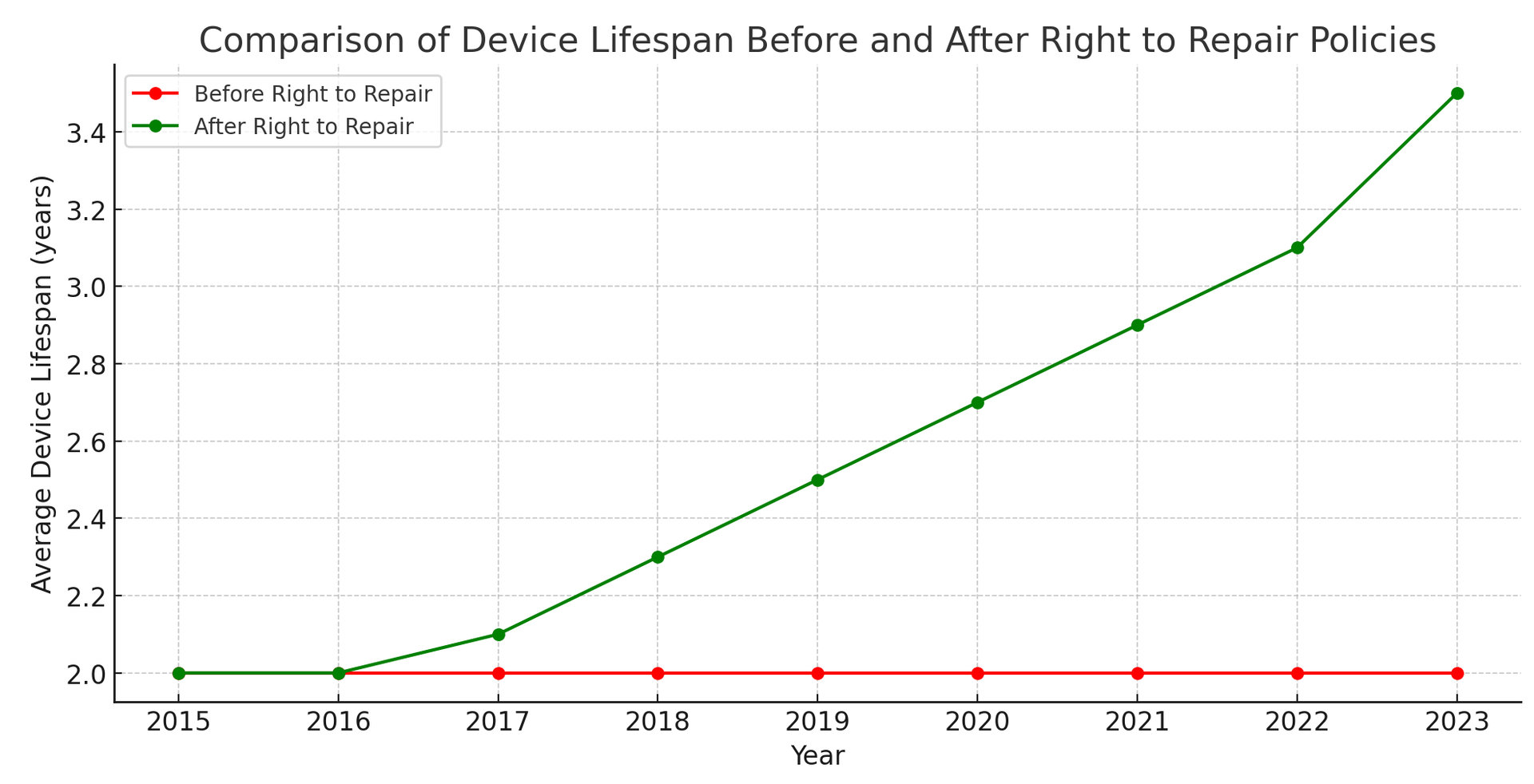 Comparison of Device Lifespan Before and After Right to Repair Policies: Ta graf prikazuje, kako se je pričakovana življenjska doba elektronske opreme podaljšala po uvedbi politike "Right to repair"/ Pravice do popravila.