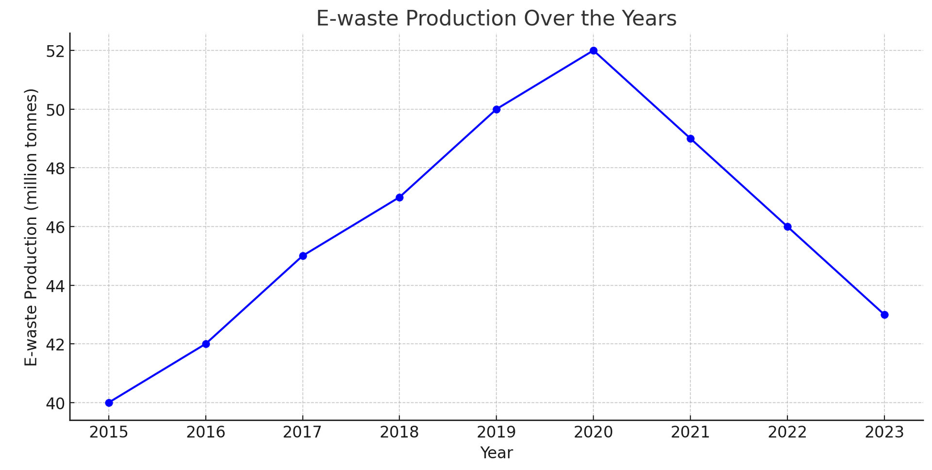 E-waste Production Over the Years: Ta graf prikazuje upadanje količine letno proizvedenih e-odpadkov. Vidimo lahko, da se je v zadnjih nekaj letih zmanjšala, kar je lahko posledica večjega poudarka na popravilu in recikliranju.